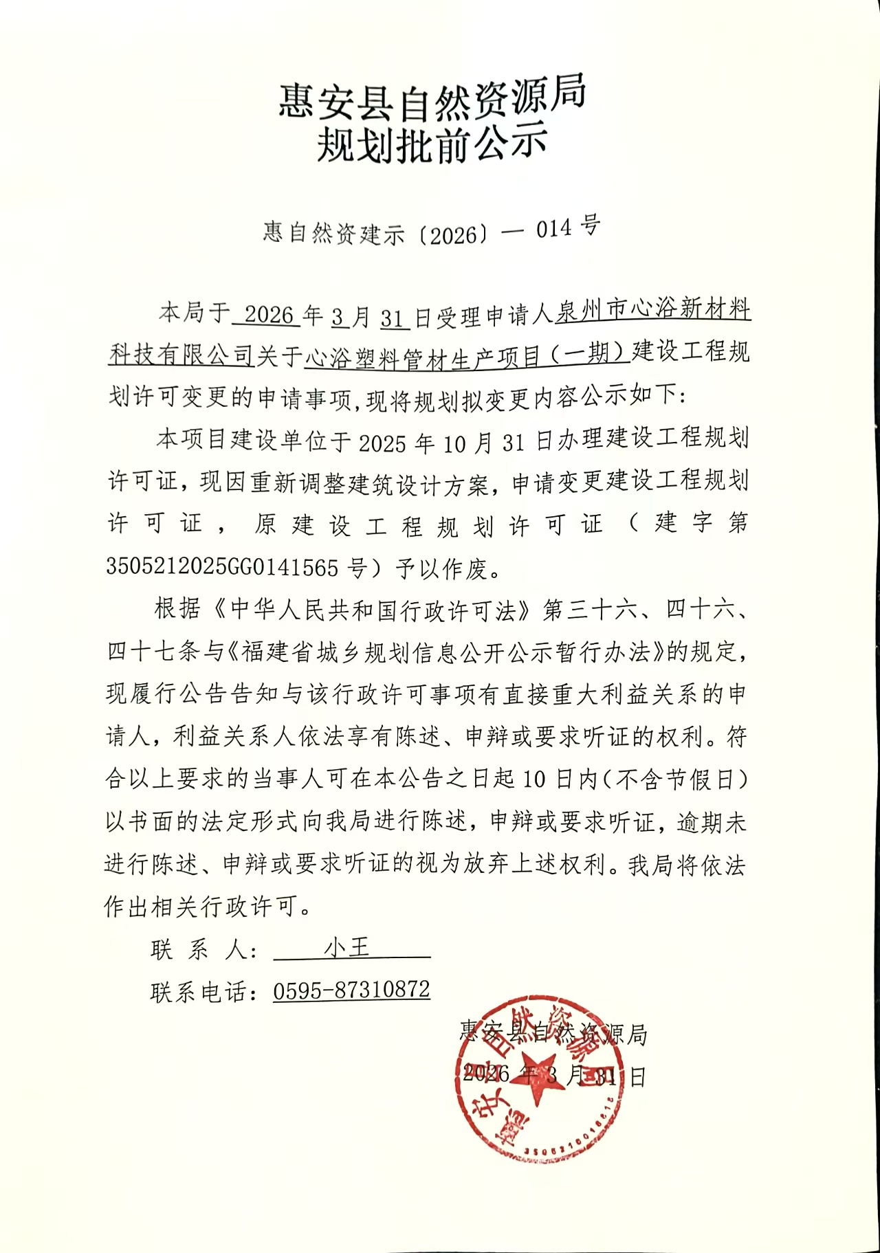 心浴塑料管材生產(chǎn)項(xiàng)目(一期)建設(shè)工程規(guī)劃許可變更批前公示