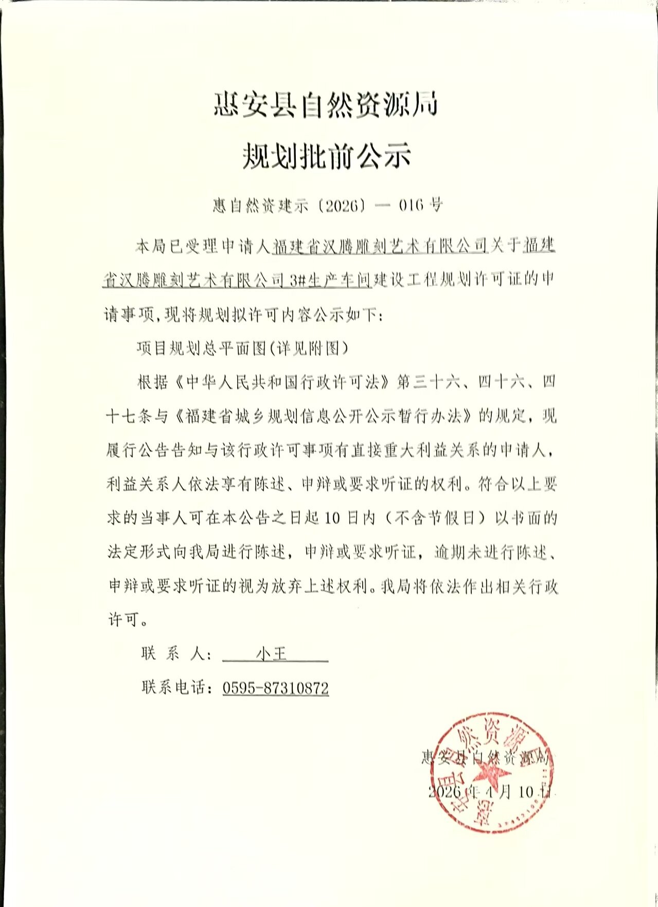 福建省漢騰雕刻藝術有限公司3#生產車間建設工程規劃許可證批前公示