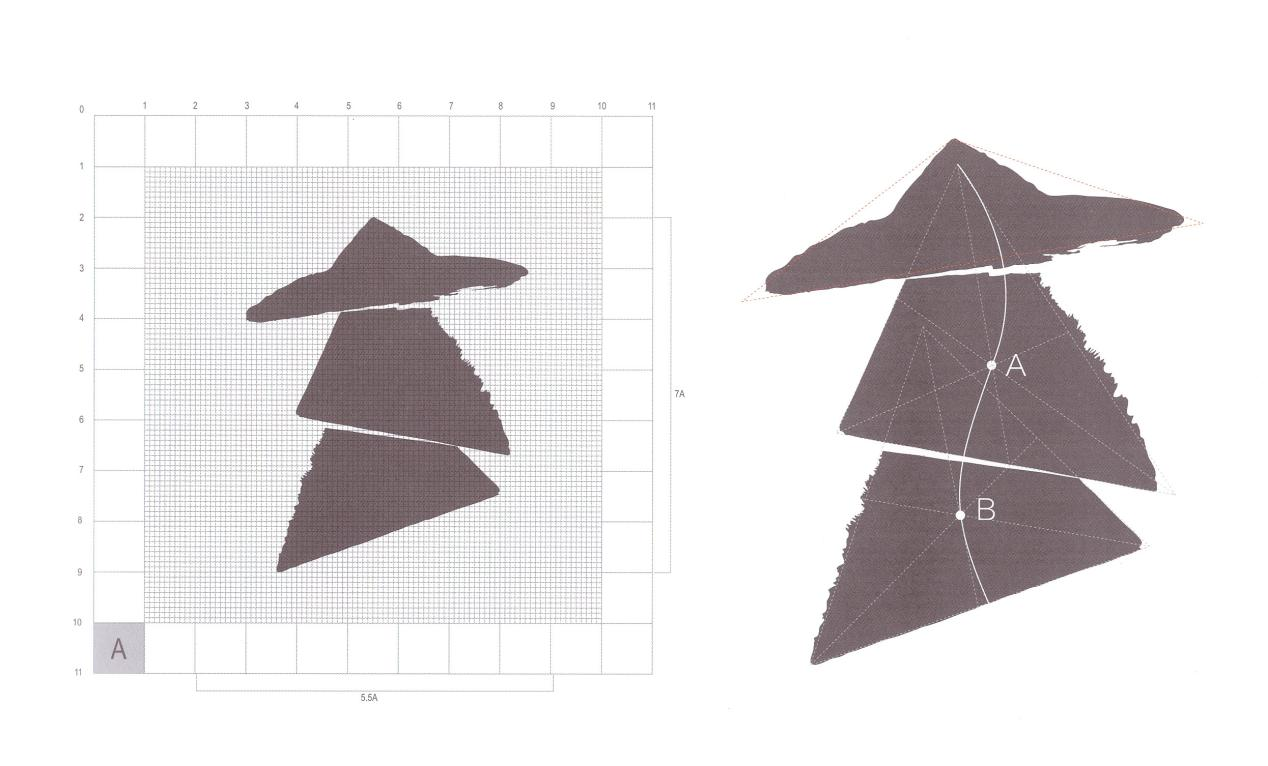 2.以三角形每條邊中心點連接對角的方式找出圖形的“重心”A和B。